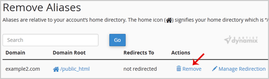 Under Remove Aliases, locate the parked domain name and click on the Remove link.