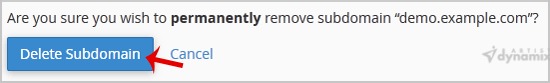5. You will receive a warning that you are removing a subdomain.example.com. You will need to click on the Delete Subdomain button to remove your subdomain permanently.