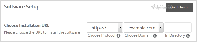 • Choose Installation URL: Choose the appropriate protocol/domain. Inside the "In Directory" field, should you want to install this in a directory, i.e., example.com/directory, enter the directory name. Otherwise, leave it blank to install in your main domain, i.e., example.com.