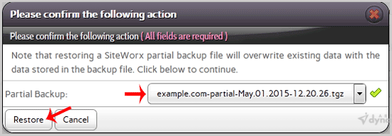 6. In the confirmation window, select partial backup from the drop-down menu and then click on the Restore button.
