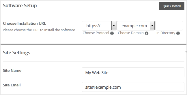 • Choose Installation URL: Choose the appropriate protocol/domain. Inside the "In Directory" field, should you want to install this in a directory, i.e. example.com/directory, enter the directory name. Otherwise, leave it blank to install in your main domain, i.e. example.com