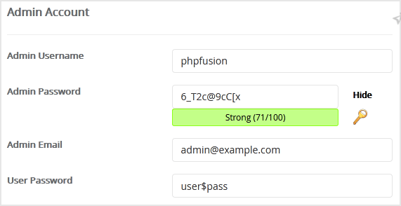 • Admin Username: Your new PHP-Fusion username (for security reason do not use the Administrator or the Admin username.)