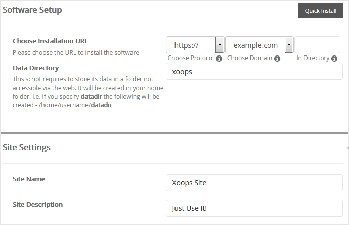 - Admin Username: Your new Xoops username (for security reason do not use the Administrator or the Admin username.)