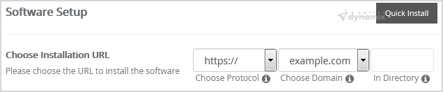 • Choose Installation URL: Choose the appropriate protocol/domain. Inside the "In Directory" field, should you want to install this in a directory, i.e., example.com/directory, enter the directory name. Otherwise, leave it blank to install in your main domain, i.e., example.com