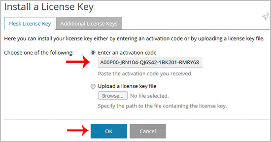 Step 4: Under Select your license type, should you have a license key, enter your Plesk Onyx license key or use a trial license by choosing Proceed with a full-featured trial license.