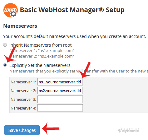 3. Under Nameservers, Select Explicitly Set the Nameserver and enter or change the nameserver in Nameserver 1, 2 fields. Then, click on Save Changes.
