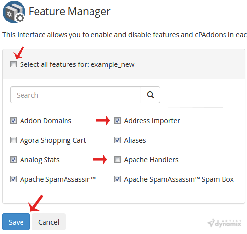 4. Tick options that you wish to add to your feature list or tick the Select all features option to enable all features and then click the Save button.