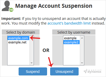 3. Under Select by Domain, choose the user you wish to unsuspend or if you know only the username, select the user under Select by User from the dropdown list. If the user is displayed in red color, it means he is suspended. Alternatively, if he is not displayed in red, then he is already unsuspended, and you don't need to take an action.