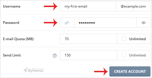 6. Change the quota and Send Limit or leave this as it is. Then click the Create Account button.